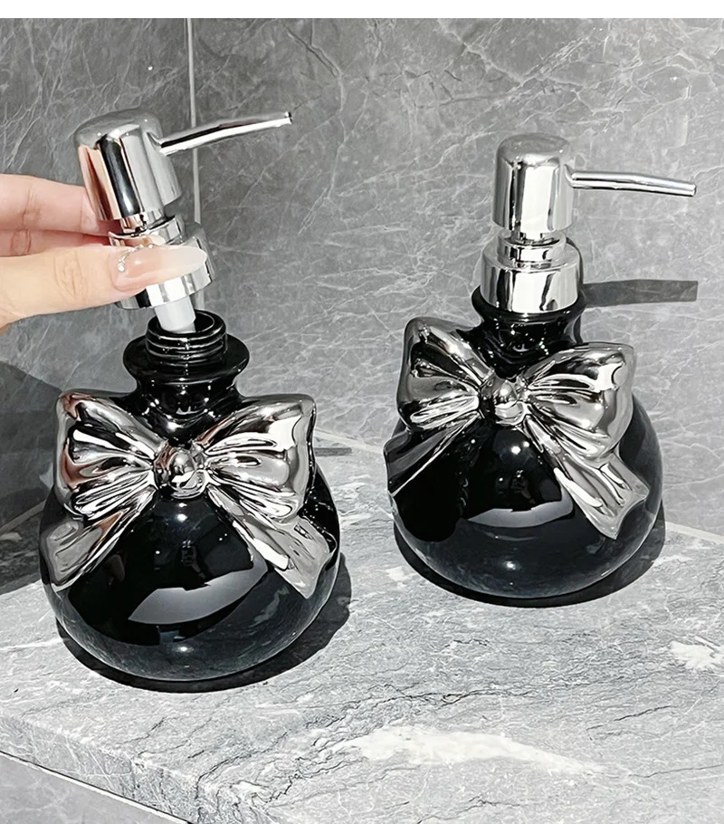 Dieser nachfüllbare Seifenspender verfügt über separate Flaschen mit eleganten Schleifenakzenten, ideal zur Organisation von Shampoo und Conditioner am Badezimmer-Waschbecken.