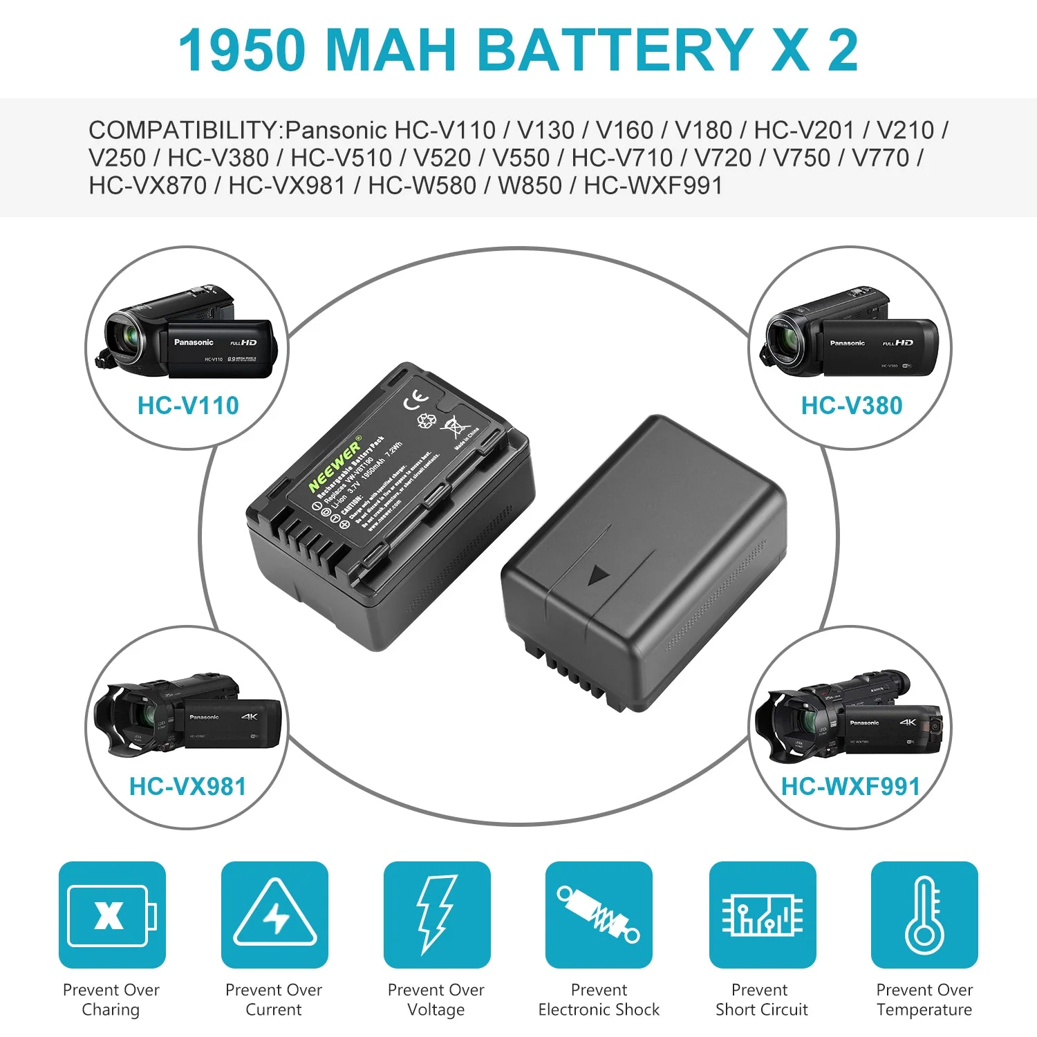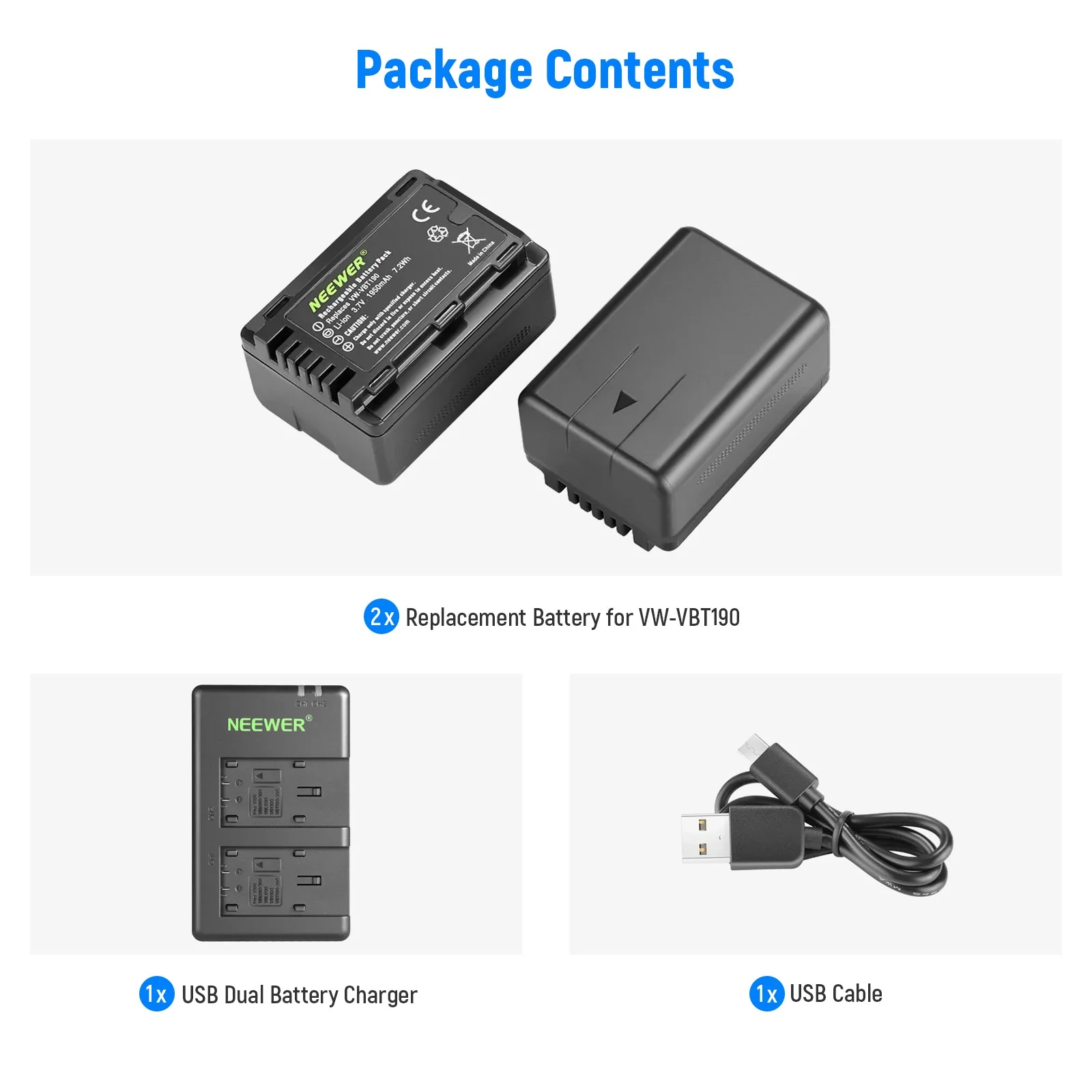 NEEWER 2er Pack Panasonic VW-VBT190 1950 mAh Akku & Duales USB Ladegerät Set