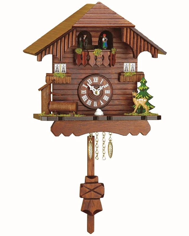 Wetterhäuser – seit Jahrzehnten ein beliebtes Produkt Schwarzwälder Uhrenhersteller mit einer langer Tradition als typisch deutsches Souvenir, Geschenk und Gastgeschenk. Denn ob es trocken bleibt oder bald regnen wird, kann man nicht an einem Barometer ablesen. Für diese traditionelle Wettervorhersage benötigt man einen Feuchtigkeitsmesser, wie ihn diese beliebten Wetterhäuschen besitzen. Die Funktion ist so einfach wie beeindruckend: Im Inneren des Wetterhäuschens befindet sich ein Strang aus Darmsaiten, der auf Veränderungen der Luftfeuchtigkeit reagiert. Je nach Luftfeuchte verdreht er sich und ändert damit seine Lage. Bei gutem Wetter erscheint so die Frau im Kleid oder der Schwarzwaldtracht, bei Regen der Mann mit Regenschirm Und längst hat auch dieser bekannte Exportschlager im eigenen Land echten Kultstatus erreicht, denn die hübschen Wetterhäuser bestechen wie die Schwarzwalduhren durch ihre Originalität, ihre phantasievolle Form und gleichzeitig präzise Funktionalität und natürlich durch die unglaubliche Vielfalt, in der sie noch heute hergestellt werden. Produktbeschreibung Original Schwarzwälder Wetterhaus mit Thermometer Motiv Berghütte mit vier Musikanten und zwei Figuren in Tracht, die sich je nach Wetterlage vor das Wetterhaus drehen. Größe: 14cm/5,6inch Farbe: bunt Gehäuse: Holz Lassen Sie sich von diesen Original Produkten aus dem Schwarzwald verzaubern oder erfüllen Sie sich einen Kindheitstraum und erleben Sie feinste Handwerkskunst gepaart mit höchster, traditioneller Uhrmacher-Qualität. Erwerben Sie mit dieser wunderschönen Wetterhäuschen ein Stück deutscher Traditionsarbeit aus der Uhrenmanufaktur Trenkle – seit Jahrzehnten Inbegriff Deutscher Qualitätsarbeit aus dem Schwarzwald.
