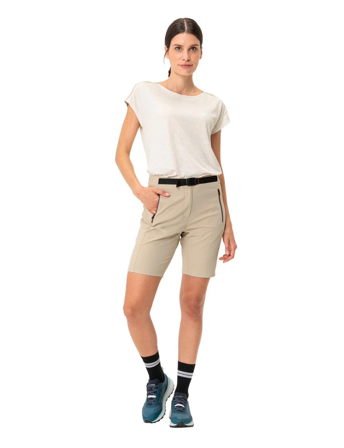Mit den Elope Shorts für Damen ist man bei Outdooraktivitäten im Sommer gut ausgerüstet. Die Damen Outdoorshorts sind sehr leicht und elastisch, aber dennoch robust und abriebfest. Die Hose sitzt angenehm und der leicht elastische Stoff sorgt zusätzlich für viel Bewegungsfreiheit. Damit bei langen Wanderungen keine Nähte am Saum stören, ist der Beinabschluss geklebt statt genäht. Der feste Bund mit integriertem Gürtel hält die Damen Outdoorshorts zudem bei allen Bewegungen am Platz und zwei Front- sowie eine Seitentasche bieten Stauraum für das Smartphone, einen kleinen Geldbeutel oder Schlüssel. Die Elope Damen Outdoorshorts sind schnelltrocknend, atmungsaktiv, können super schnell und einfach gewaschen werden und punkten mit ihrer sportlich, funktionellen Optik. Ein praktisches Must-have für den Sommer also. Die Shorts für Damen sind Teil des Kreislaufkonzeptes. Sie bestehen aus Polyester; Teile aus anderen Materialien lassen sich abnehmen. Außerdem weisen sie Details auf, die in Richtung Kreislaufwirtschaft gehen, zeichnen sich durch einen materialeffizienten Schnitt aus und sind robust. Das VAUDE Green Shape-Label steht für ein umweltfreundliches, funktionelles Produkt aus nachhaltigen und bluesign® zertifizierten Materialien.